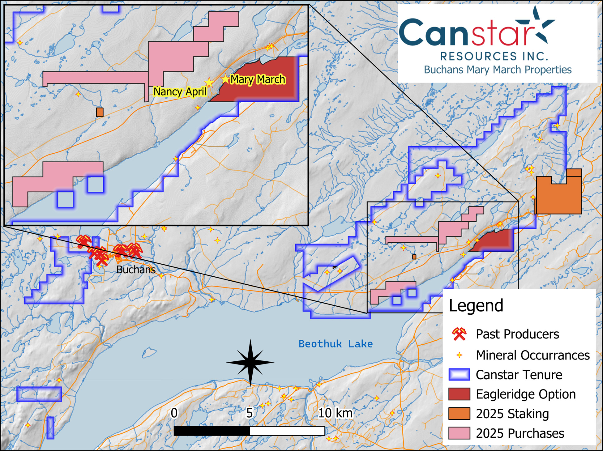 Over the past 12 months, Canstar has staked new licenses and purchased claims from prospectors to systematically expand and consolidate its land package at Mary March to build a contiguous, district-scale position in what management believes is one of the most prospective yet underexplored portions of the Buchans camp.